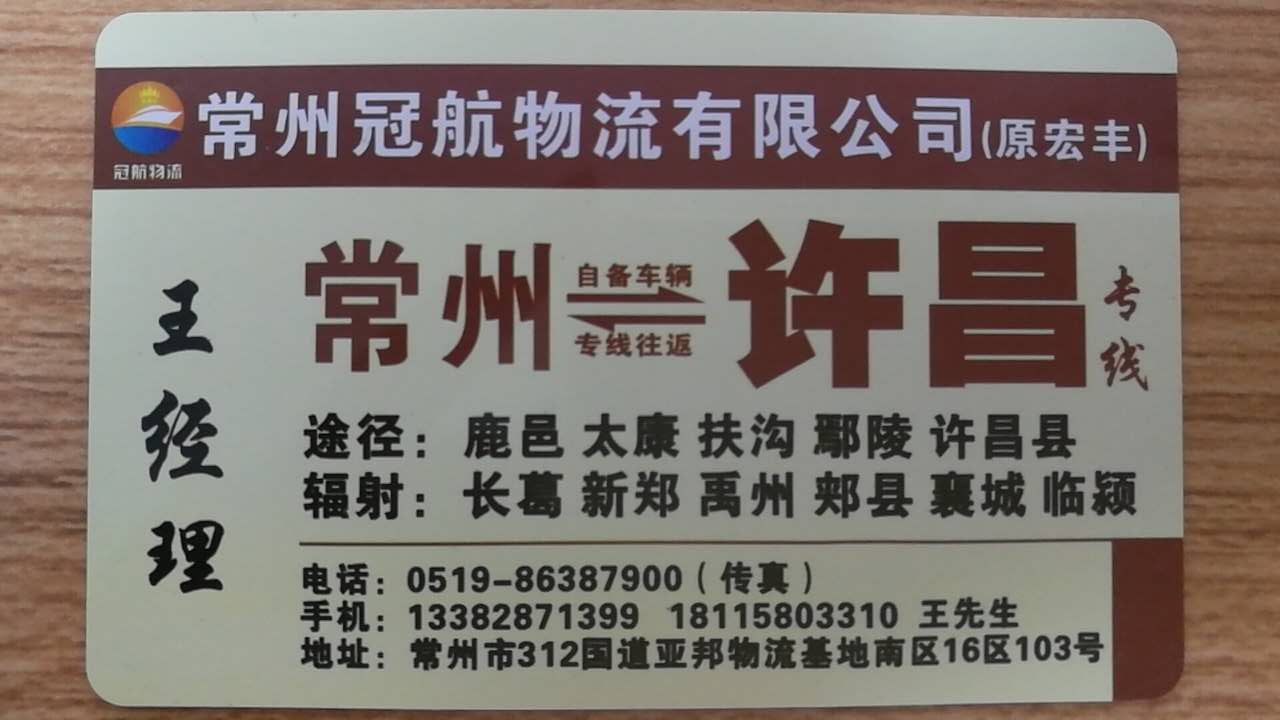 公司名称: 常州冠航(原宏丰)物流有限公司 [公司详情]